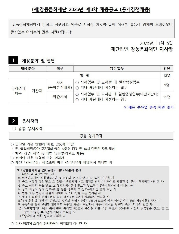 제목 강동문화재단 2025년 제8차 채용공고